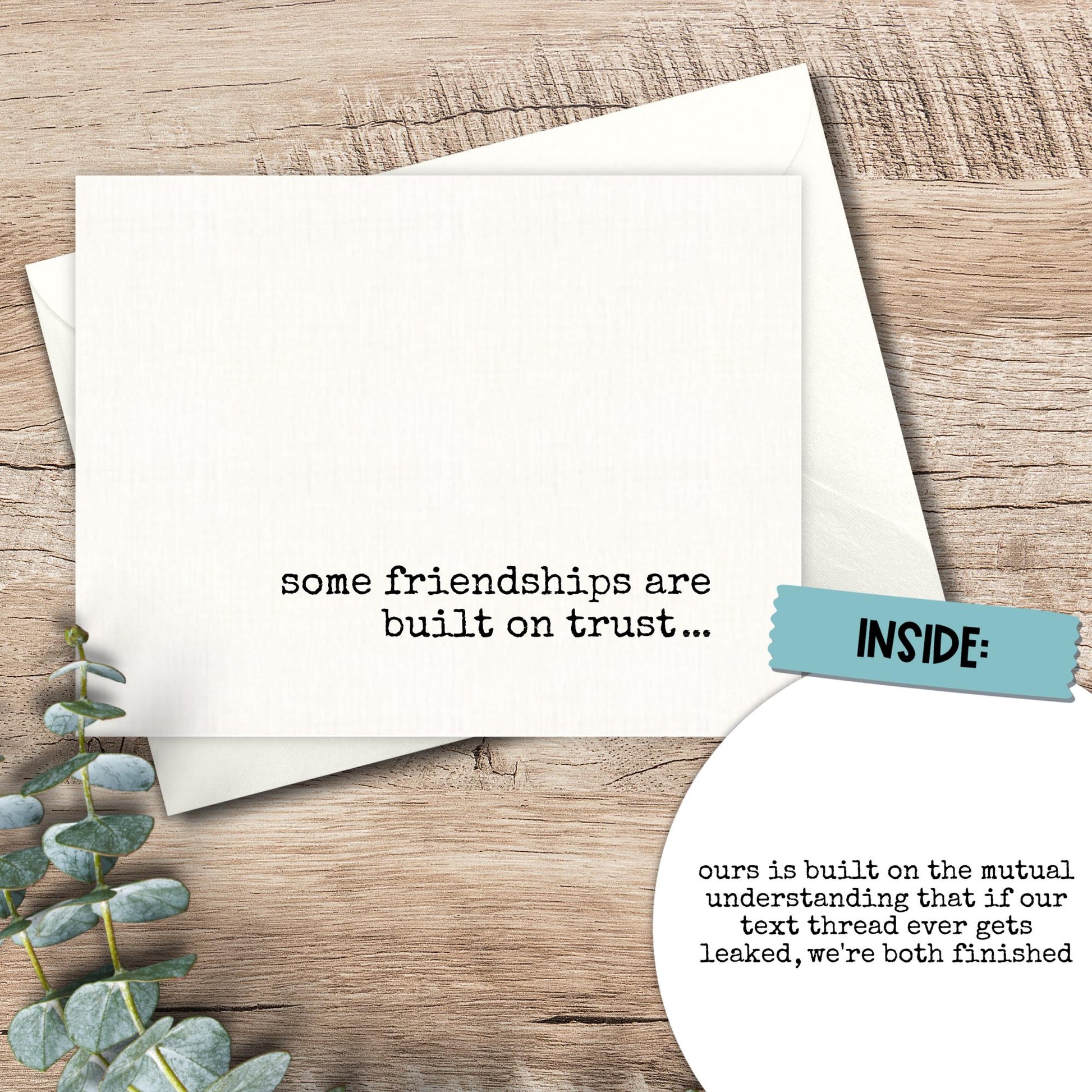 Anyone in a group chat knows what would happen if those chats got leaked. A fresh take on the "thinking of you" greeting card. Put down the cell phone and send a message that won't appear in your digital footprint. (Do I watch too much Dateline? Probably.)